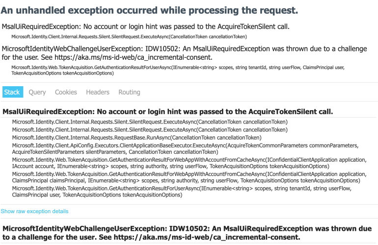 MicrosoftIdentityWebChallengeUserException: IDW10502: An MsalUiRequiredException was thrown due to a challenge for the user. See https://aka.ms/ms-id-web/ca_incremental-consent.