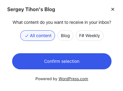 You may wonder, what does this mean to you? It implies that you will also receive email notifications about my occasional blog posts, aside from the F# Weekly newsletters. If this deviates from your initial subscription interest, I deeply apologize. Feel free to modify or cancel your subscription. Gratefully, I’ve managed to configure WordPress to allow you to set your subscription preferences (as seen in the screenshot below). If my “musings” outnumber your tolerance, you can simply select the F# Weekly category 😁