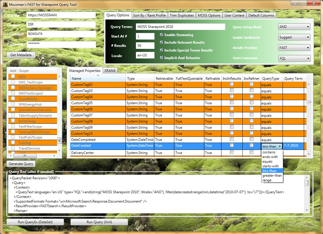 To query F4SP we use the same web service as for build-in SharePoint 2010 search, but with a bit different query XML. The last thing that we need to do is to build query.You can find query XML syntax on Microsoft.Search.Query Schema, but it is hard enough to work with it using official documentation. There is a very useful CodePlex project called FAST Search for Sharepoint MOSS 2010 Query Tool which provides a user-friendly query builder interface.