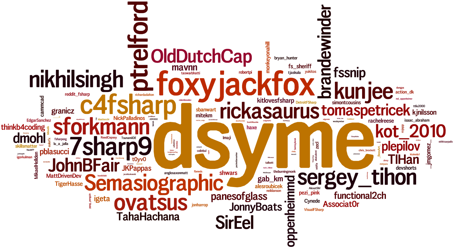 The first picture on the top of this page is based on total twitter activity around #fsharp hashtag. The size of twitter names depends on sum number of people tweets and retweets. Other charts are self descriptive. Thank you guys for your effort, let’s make 2014 even better.