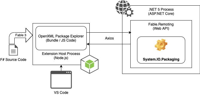 When extension is activated it starts .NET 5 process with API exposed using Fable.Remoting.