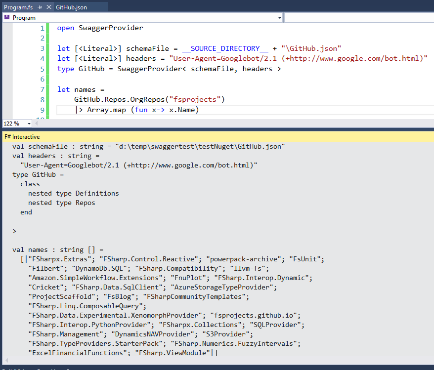 Let’s say that we want to call GitHub APIÂ to get all fsprojects repositories. For this API call schema will look like this